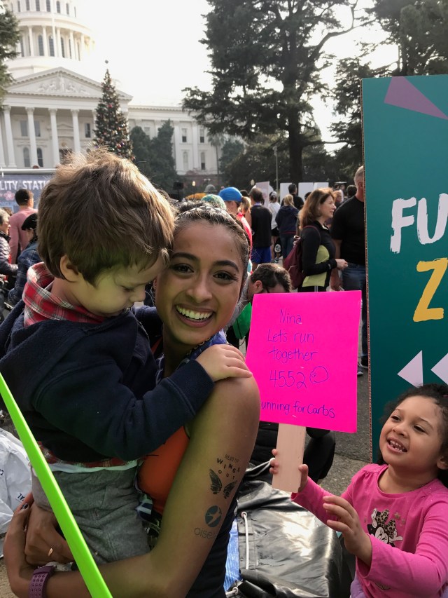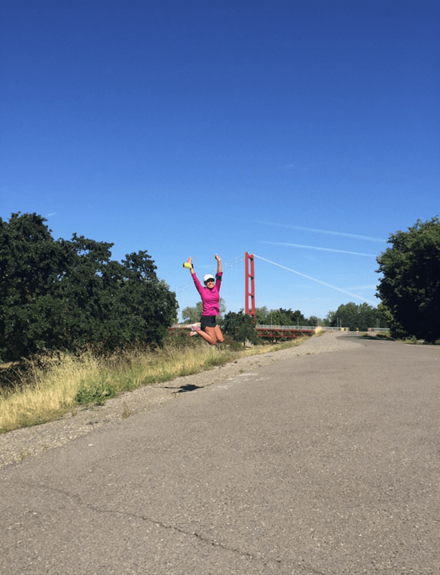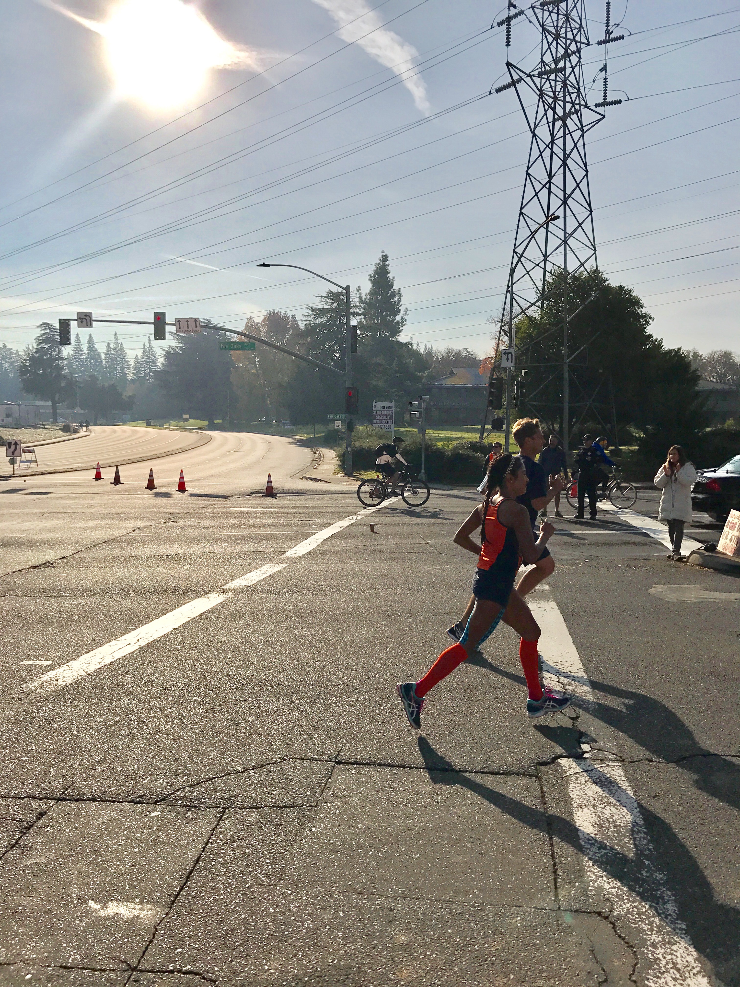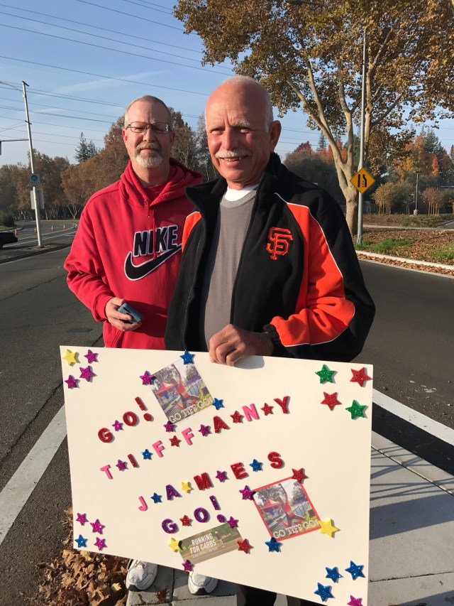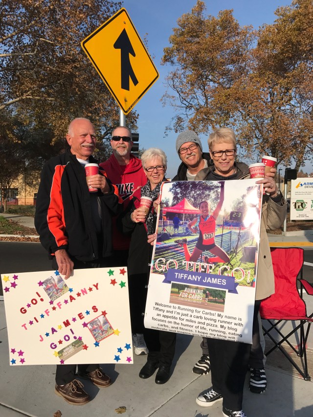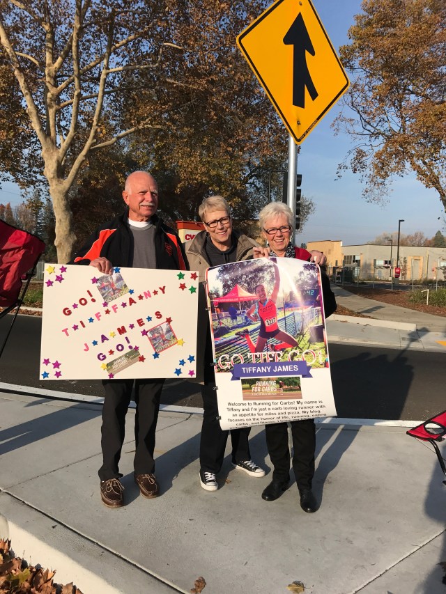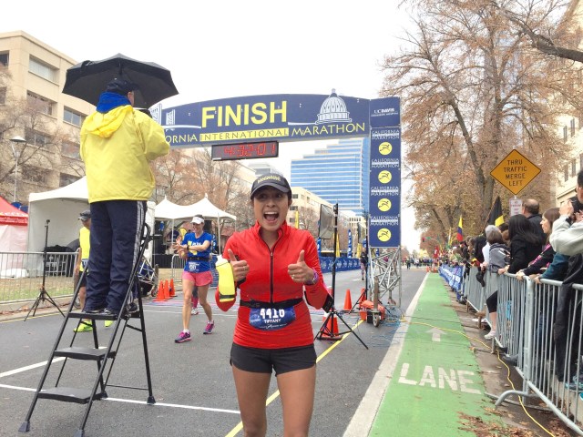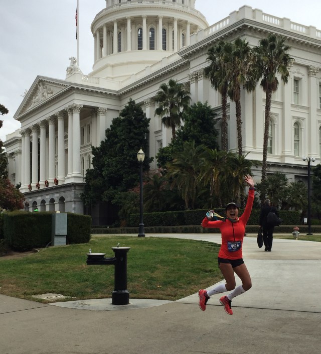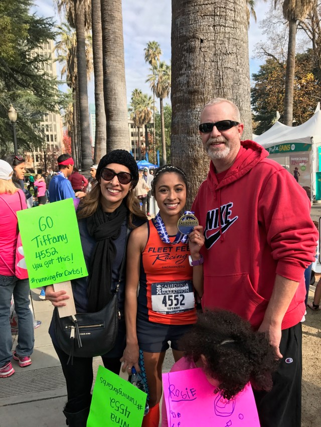 Seeing my husband at mile 20 was a wonderful feeling. He was so happy for me and kept telling me how well I was doing. To be honest, I think he was a little surprised. In my past marathons I always struggled prior to seeing him and never met my time goal. We cruised through miles 20-22 and I was delighted to see my dad in front of Loehman’s plaza cheering with his coworkers and apparently making a Facebook live video. After passing him, I saw my friends from the Fleet Feet Racing team and yelled to Dan, “there’s my friends!!!” I was so excited to see them and I could feel their energy. Seeing my friend Jen and Cindy made me feel a sense of comfort and ease. Their smiling faces and cheering was the breath of fresh air I needed to keep going. I Felt like I was flying. We passed “the wall” and I was ecstatic. I even said, “F you wall, woo hoo!” I think I may have jumped up at this point. After passing the wall we were greeted by my dad and nephew who were cheering me along and telling me the rest of the family were coming up. Seeing my family on the corner of Fair Oaks and Howe Ave was one of the most special feelings. They were screaming and jumping up and down. It put a huge smile on my face and I couldn’t have been more happy in that moment, and tears of joy fell down my cheek. My husband saw how excited I was but reminded me to relax and use that energy to tackle the Sac State bridge ahead.