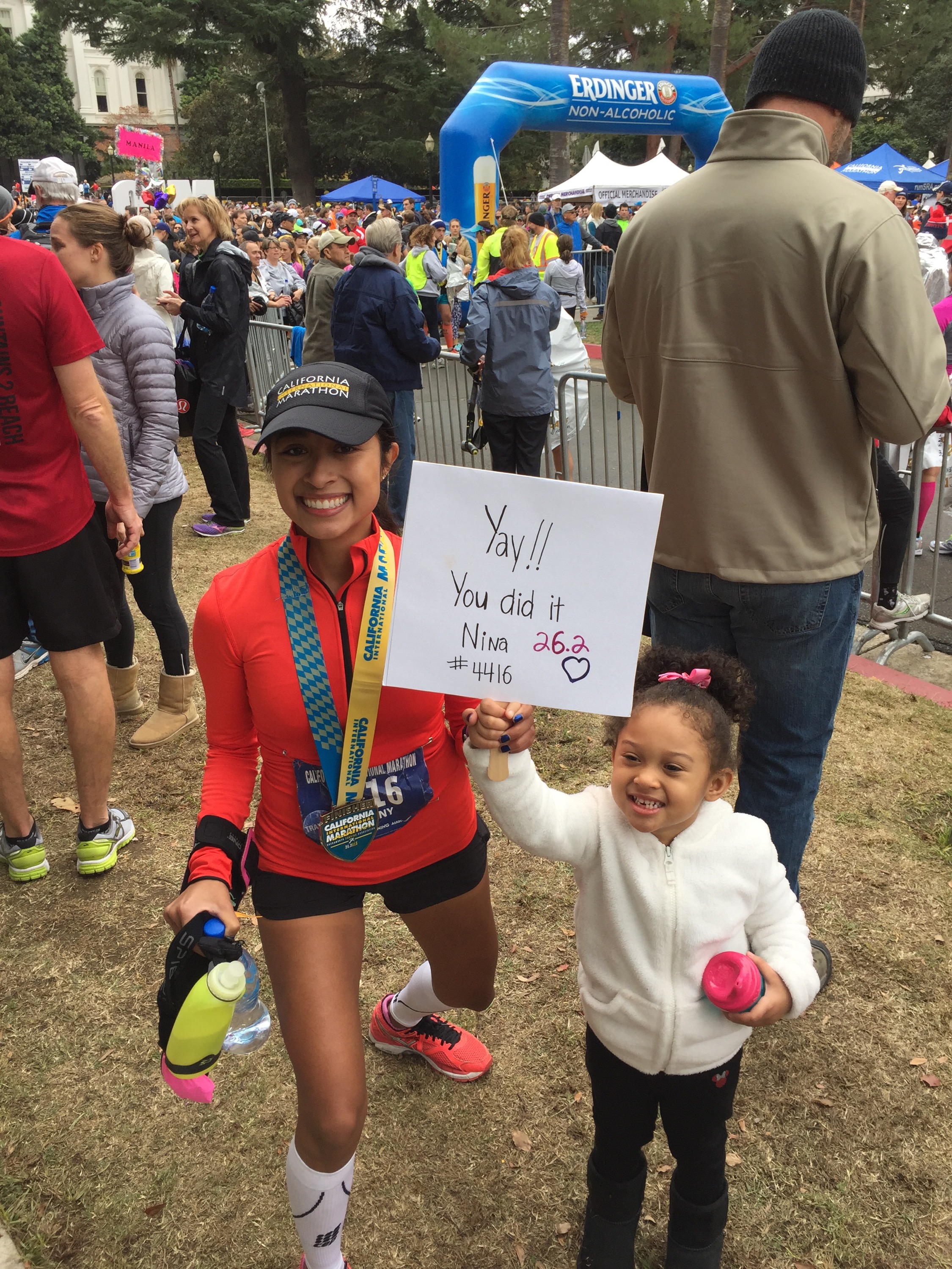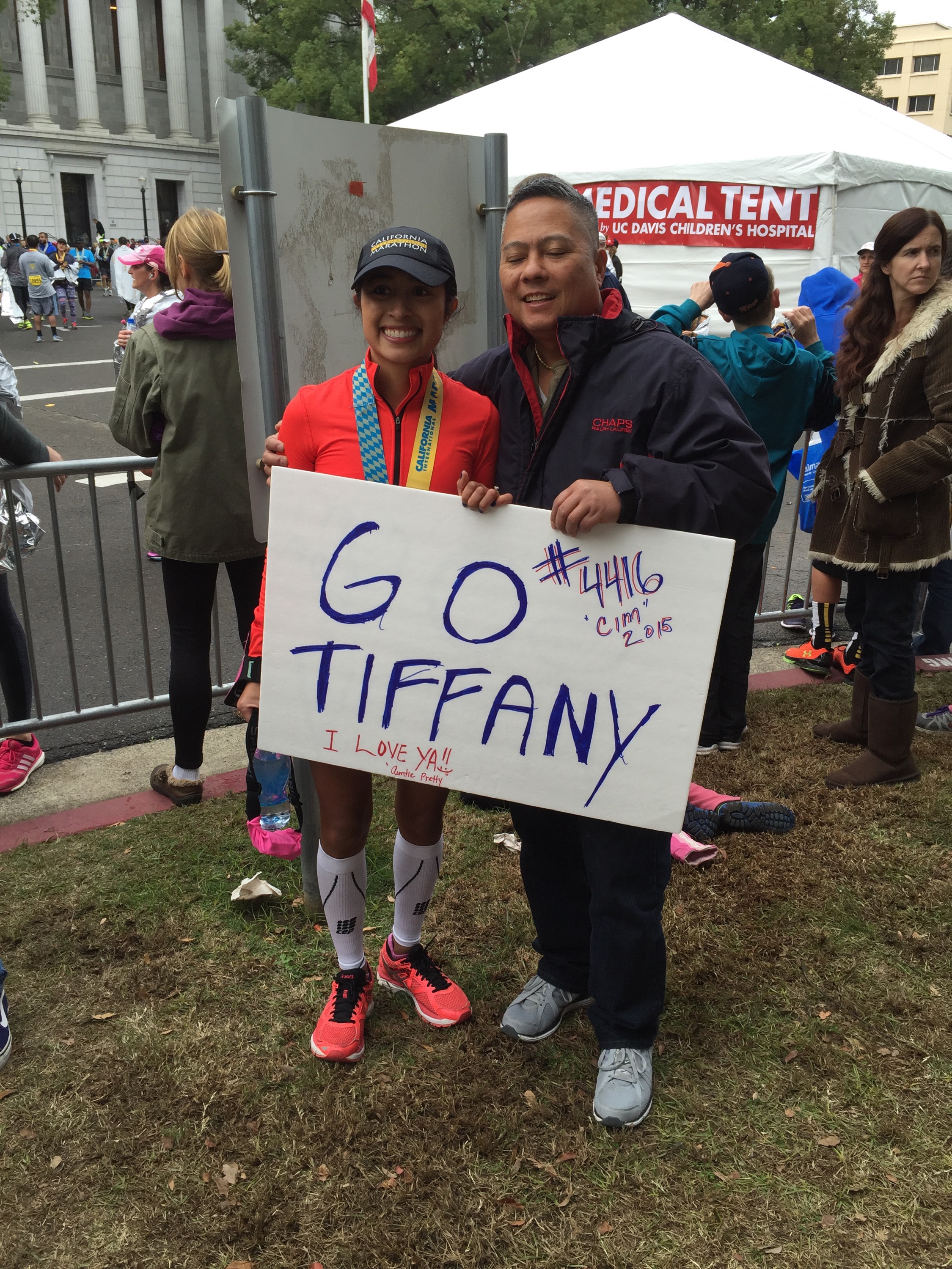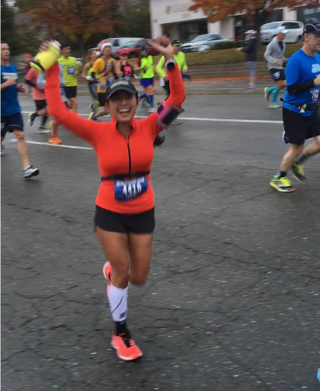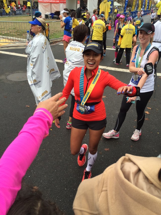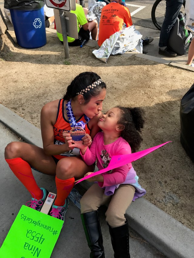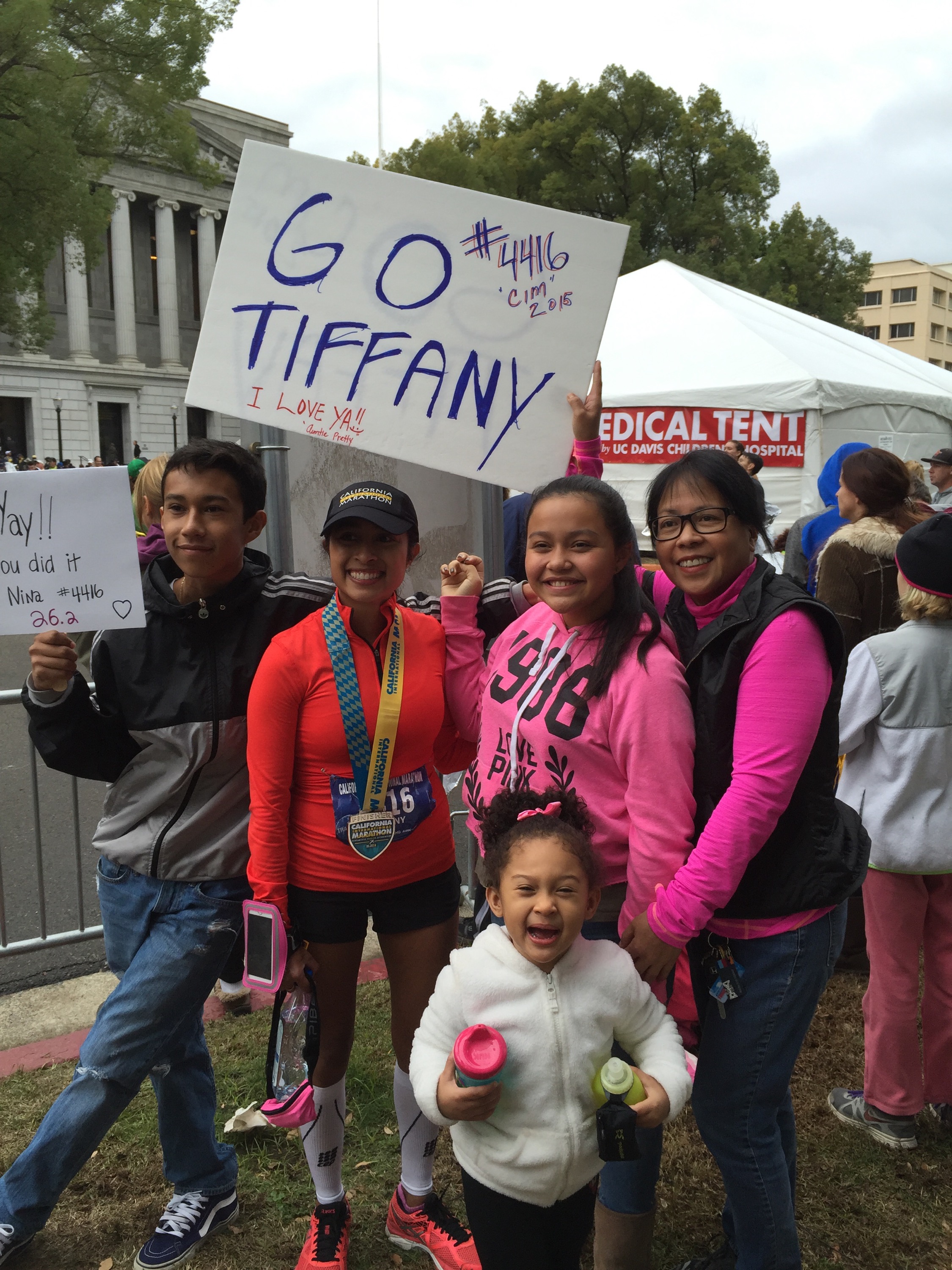 Finally, I stood up and drank some water and began to feel better. I saw my family waiting in the cheer section. My parents shouted at me, “Did you get it, did you get it?” I broke down sobbing and said, “I did it!!! I qualified for Boston!!!” I hugged my mom, dad and sister and we cried together. This was the first marathon my sister has ever been to and it was a special feeling having her there. My parents were ecstastic and my mom cried as much as me! Being greeted by my family at the finish is always one of my favorite highlights. We all hugged, we cried, and we laughed. My niece and nephew who are only two and four were so excited to see me. My nephew asked me to carry him and my niece wanted to wear my medal, I love these two so much. My friend Mariana and Henry met us at the finish and we cried and hugged. She has heard me complain and talk about everything running for months, and always encouraged me to never give up and go for a BQ, even when I doubted myself.