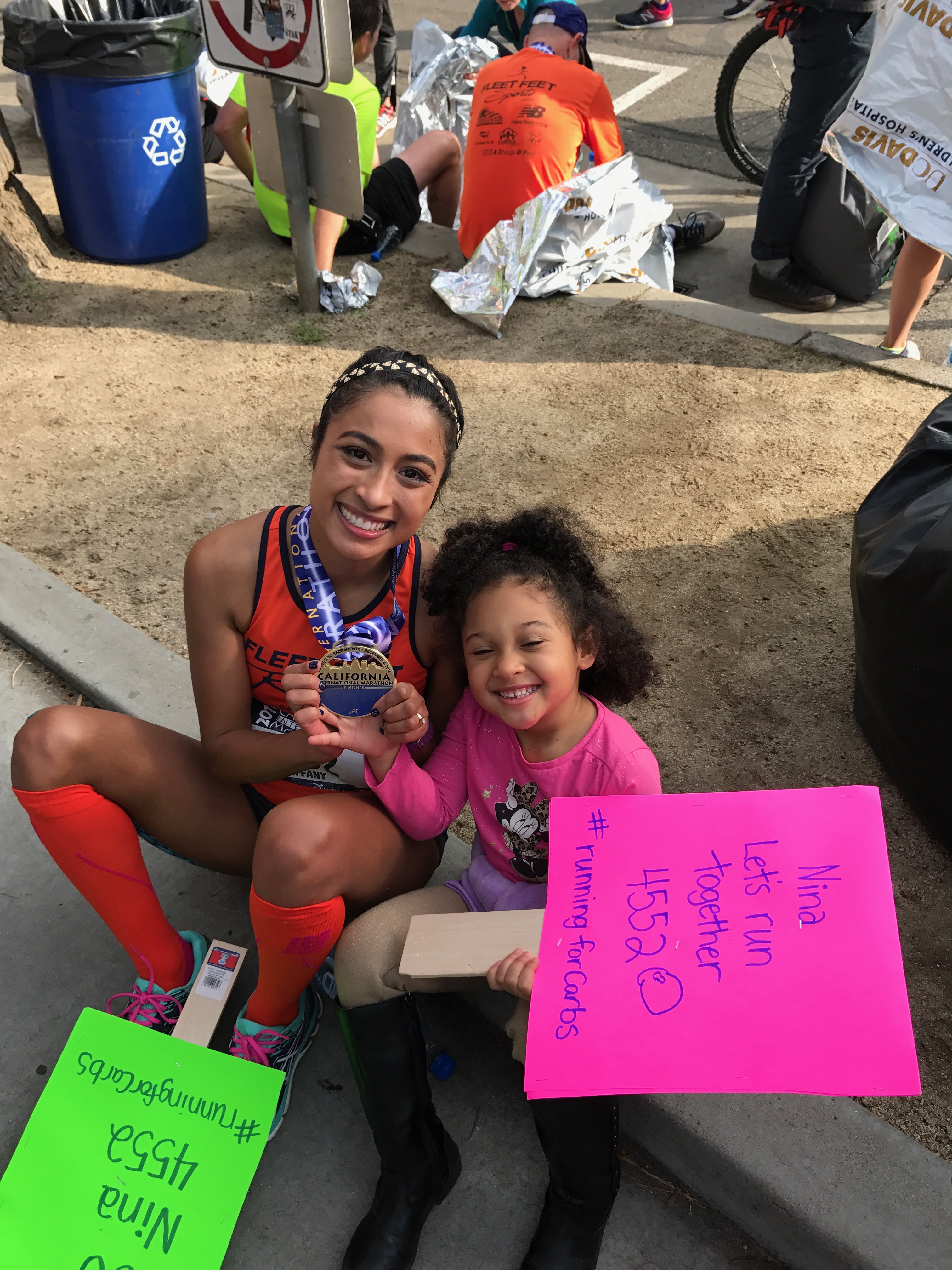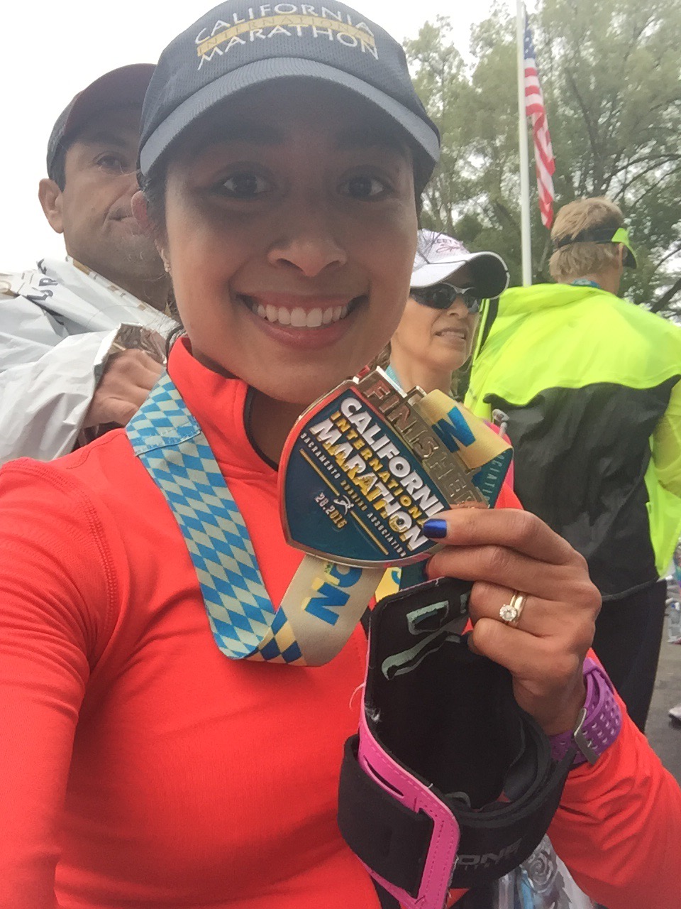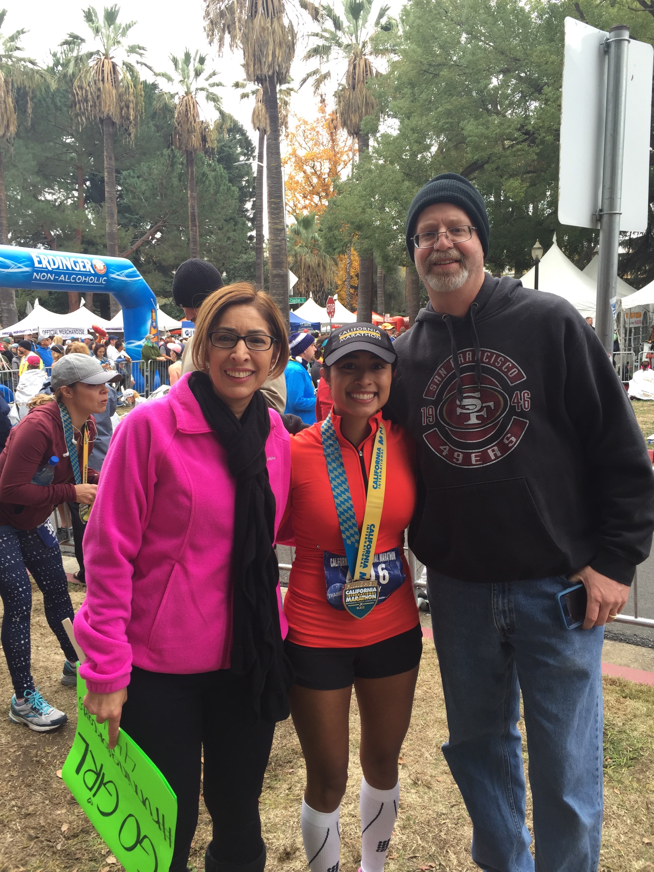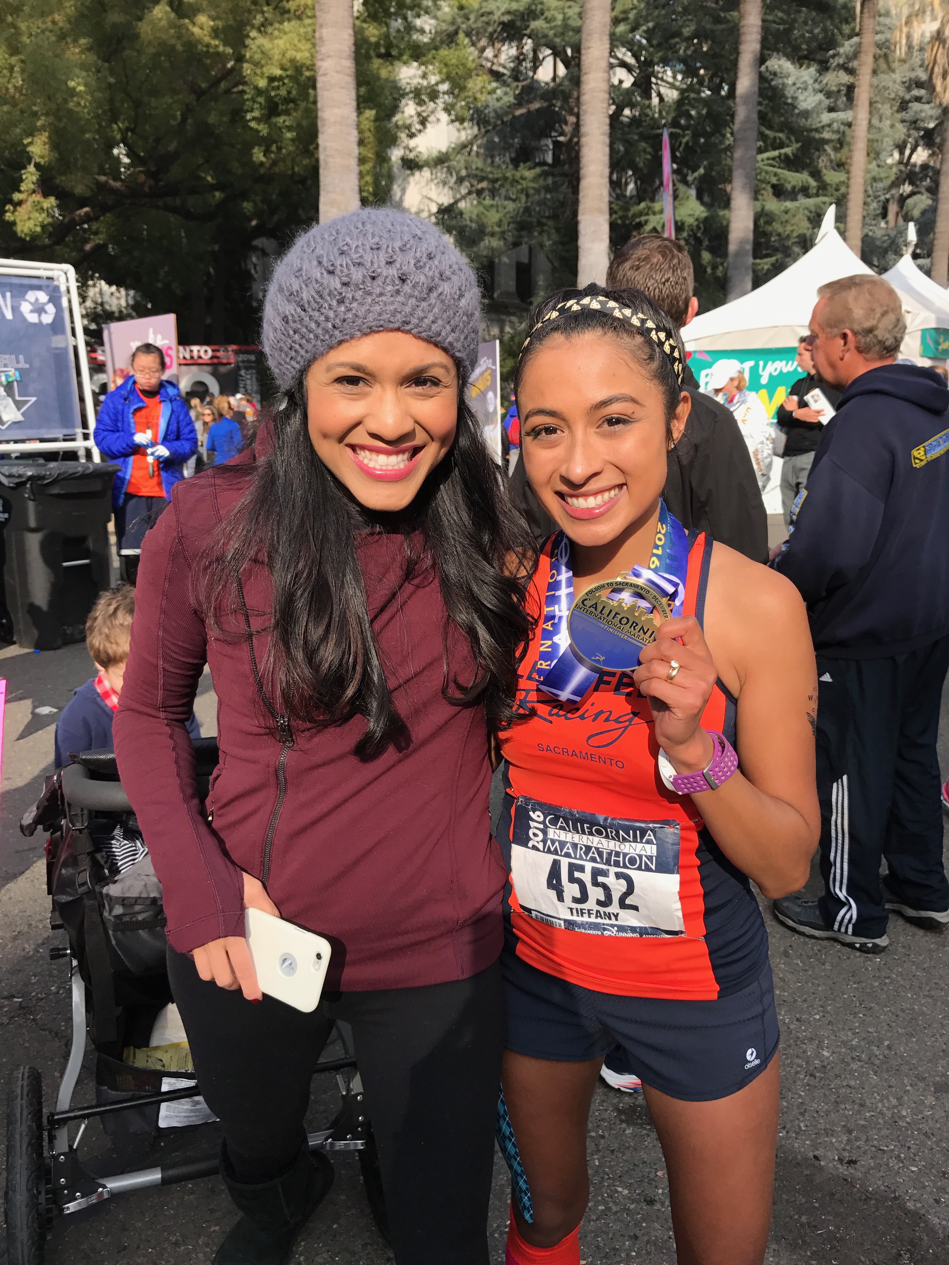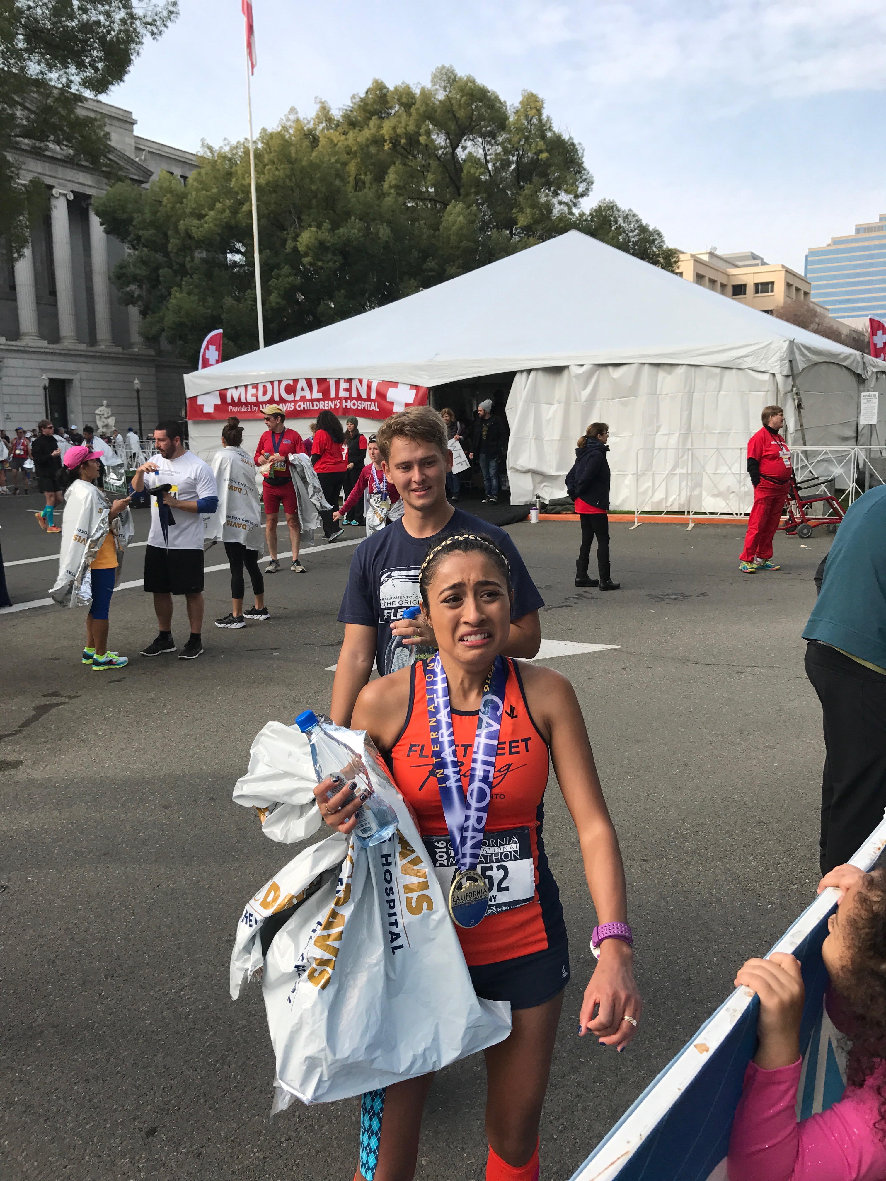 Finally, I stood up and drank some water and began to feel better. I saw my family waiting in the cheer section. My parents shouted at me, “Did you get it, did you get it?” I broke down sobbing and said, “I did it!!! I qualified for Boston!!!” I hugged my mom, dad and sister and we cried together. This was the first marathon my sister has ever been to and it was a special feeling having her there. My parents were ecstastic and my mom cried as much as me! Being greeted by my family at the finish is always one of my favorite highlights. We all hugged, we cried, and we laughed. My niece and nephew who are only two and four were so excited to see me. My nephew asked me to carry him and my niece wanted to wear my medal, I love these two so much. My friend Mariana and Henry met us at the finish and we cried and hugged. She has heard me complain and talk about everything running for months, and always encouraged me to never give up and go for a BQ, even when I doubted myself.
