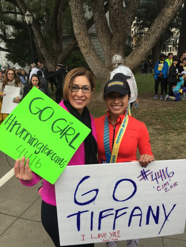 Running along L street I had to try my hardest to stay motivated. I wanted to quit, hell I wanted to walk. I looked down at my watch when I noticed I was losing time. For the longest time I was sticking behind the 3:30 pace group and suddenly saw them pass me. I began to freak out and yelled at Dan, “where is the 3:33 pace group, are they behind me?” He was yelled, “don’t worry about that right now, keep moving and let’s do this.” I saw my coworkers around Sutter and wanted to stop and stay with them. I wanted to cry and fall down. I felt really weak at this point. As we passed by they yelled, because they saw how much I was struggling, “we love you Tiffany.” My heart was so happy. I knew we were getting closer to the Fleet Feet Sacramento Aid station and that I would see more of my coworkers soon. I saw Dusty and Staci and looked over to them with a look that said, “please help me.” Dusty gave me a dose of tough love and it’s what I needed to hear. He yelled, “How bad do you want it?” At that moment I had to ask myself, “how bad do you want it Tiffany?” Dan kept counting down the streets and at this point I couldn’t really hear him anymore. I was in a weird place mentally. We saw the 3:33 pacers pass us and I felt like I was seeing my dreams slip farther and farther away. Dan wouldn’t let the gap between the pacers and myself get too big. He kept telling me about “how hard I worked and he wasn’t going to deal with me upset because I gave up on my goal this close to the end.” He kept asking me what time I had on my watch and I ignored him. He kept telling me to go faster, and I yelled with frustration, “I’m doing the best I can!” At this point, I had picked up my pace but I wasn’t at my targeted pace. I saw how close the end was and I questioned if I was going to be able to do it. Dan grabbed my hand and forced me to move faster. He yelled, “what the mind can conceive, the mind can achieve.” He had made signs with motivational sayings the week of CIM and posted them around the house. This was the one saying that stuck with me the most, and I needed to hear it at this moment.